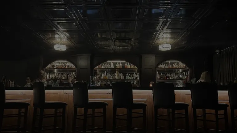 a dimly lit bar with chairs