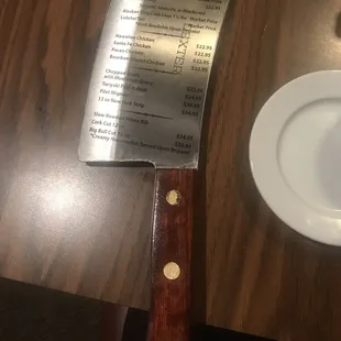 The menu is on a very heavy butcher knife. A very original and cute idea.