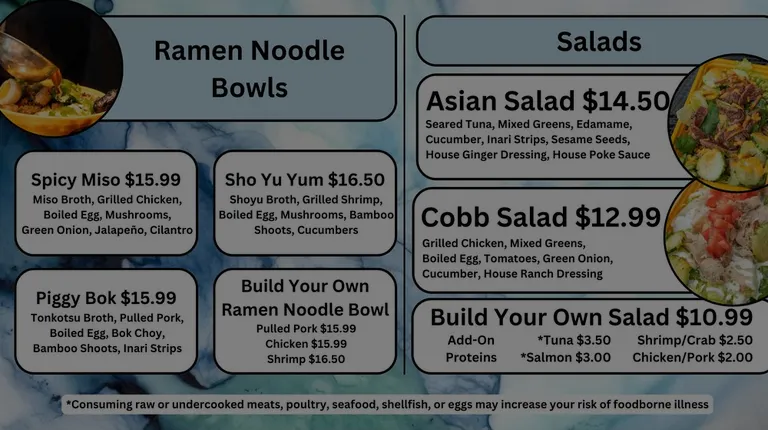 The restaurant was not kept up with. Dirty rags left on the ordering counter. Unclean practices with utensils used to scoop out broth. The staffer was on her cellphone with gloves on, then proceeded to use those same gloves to serve our food. We all know how filthy our phones are. She accidentally coughed directly over the open sides and wiped her eyes with her hands. Which she apologized for while continuing to put our bowls together. This should've been our Que to turn away... but neither my hubby or myself like the making people feel weird...So we trucked on. When we got our bowls, the broth was less than room temperature. The staffer was nice and replaced it and acknowledged the machine wasn't turned on that kept it hot. As well as offered free boba tea and 10% off our next order. Unfortunately, that wouldn't be necessary because the pork she replaced our meal with seemed to be spoiled. It tasted and smelt extremely gamey and rotten. We ended up throwing out our meal and taking an L for our date night. Maybe it was an off day...but with all the discrepancies...I would not recommend this place because the care and quality just isn't there. Also, for $16+ dollar ramen bowls... the portions were not it. Do better.