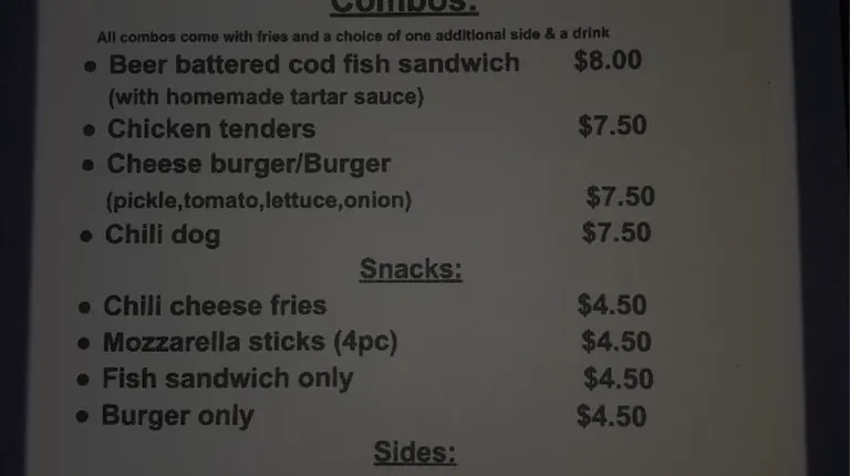 This place is very down-home and welcoming. The owners, Mike and Carrie, are absolute sweethearts. Everything was so fresh and prepared to order. The Beer Battered Fish sandwich with the house tarter sauce is delicious. The fries are enormous. You will not leave hungry. Baked Beans and cole slaw round out a full meal. The hotdogs are a good option as well. They offer a call-in to order but allow them about 20 mins as they make everything fresh to order. Their hamburgers are some of the freshest around. The food is not frozen burger patties that are not massed produced. This place is genuinely a very welcoming and down-home restaurant--highly recommended.