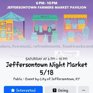 Jeffersontown Farmers Market has an eclectic selection of foods and Artisanal homemade goods! Opening on Derby Day!Over 20 local vendors to shop from. For links to the social media pages of these vendors check out our post on the Louisville Food Reviews homepage on Facebook. Sunny Acres FarmBarrick FarmsGoodin View FarmBranham FarmsHillview FarmNaked GreensPout Baby & Co.Sprucelake Woodcrafts Marcy Mae'sToomSauceBerserker Brew CoffeeSimply MediterraneanMcIntyre's Winery & Berries LLCRankin FarmBackwoods JackNutsaboutcha Honey Lane FarmsZenful Little ThingsSasa Samosa KitchenHoneyBear FarmsViolet Daisy BakeryDesigns By NanThe Popsicles Fish CompanyBourbon Barrel Bakeshop