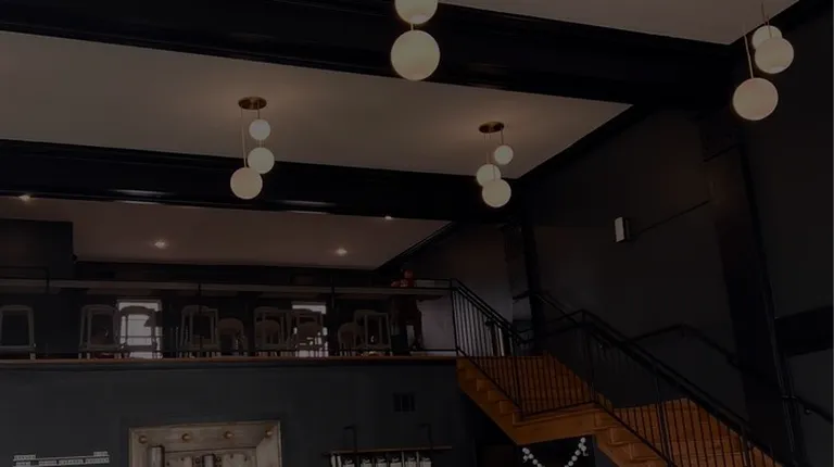 a coffee shop with a counter and stairs