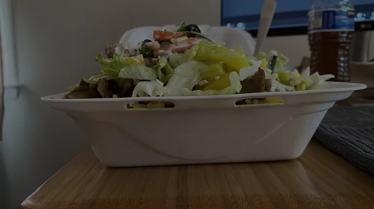 Extra meat from pita on rice with veggies. Love the tabouli, cucumber, black olives, onions, jalapeños, and feta cheese.