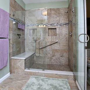 Louisville bathroom remodel featuring walk-in shower with frameless shower door, elegant tile flooring, updated closet storage and more...