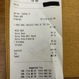 I rarely post negative reviews but after a horrible experience at Takashi, I just needed to. My husband and I placed a to go order and we waited almost an hour for our food. The server kept telling my husband that our order is almost ready, but we found out that the kitchen staff forgot to make one of our orders; hence, the delay. I understand that new restaurants need a lot of time to adjust, and this would normally not have upset us. However, one of the servers (who I was told was the wife of the owner) not only accused us that we just got there to pick up our online order and that we didn't really wait that long. Below is a photo of our receipt where my husband placed a to go order in person at 8:00 pm. We finally got our orders at 8:50 pm. We would have left and gone someplace else, but my husband has already paid and even gave them a tip. In exchange for their mistake and for our time and frustation, they just gave us a small bowl of fried rice which we did not ask for and did not want.Additionally, the said server continuously tried to put her arms around me without my permission, and tried to appease me by promising that our food will come out soon. I did not know this server personally, and her actions made me feel very uncomfortable. She invaded my personal space and was downright unprofessional.Food is overpriced for the quality and quantity. They also charged us extra for sauce. We have had much better poke bowls and bibimbaps at other places. Takashi is owned and run by Filipinos, and as a fellow Filipino myself, I really wanted to support this restaurant. However, we are deeply appalled by our experience and we will never return. If you are looking for an authentic Japanese restaurant with exceptional service, I would recommend looking elsewhere. Takashi is simply not it.