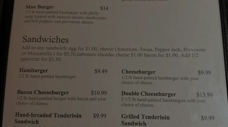 Great service and large portions of tenderloin--got 3 meals from one serving. My husband got two from his cheeseburger.