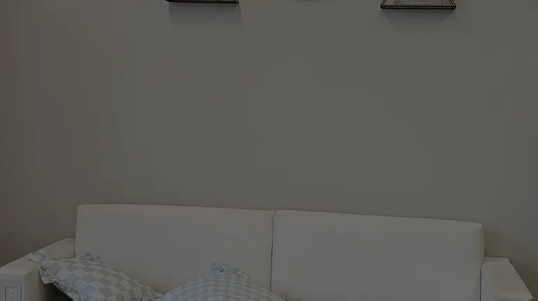 a living room with a white couch and coffee table