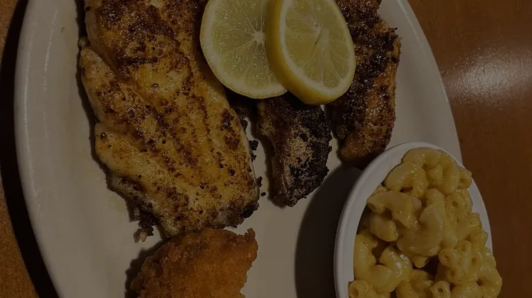2 pc catfish dinner, 2 sides, 2 hushpuppies, $15.99 ($10.99 lunch special Mon-Fri)catfish...8/10..seasoned well, but the pcs are smallcandied yams...7/10...too much nutmeg, not enough sugarmac and cheese...6/10...lacks flavor, very blandhush puppies are good, but greasy to mereceived 2 packets of ketchupDefinitely not worth $15.99, but is worth $10.99...