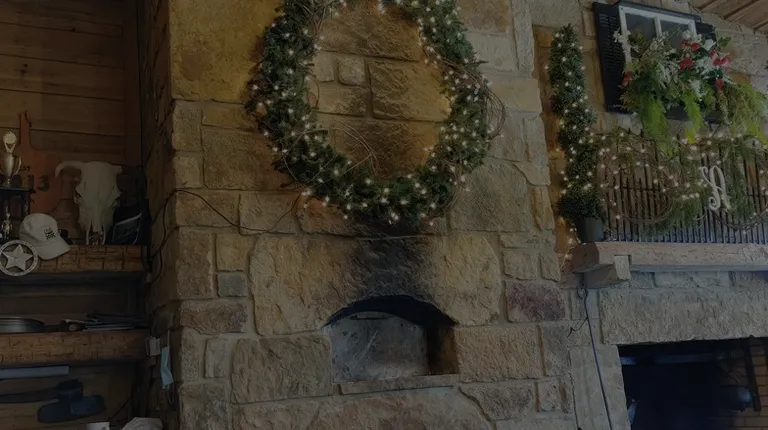 a stone fireplace in the back yard