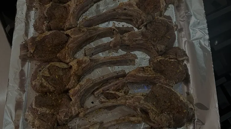 Package of frozen lamb chop racks.