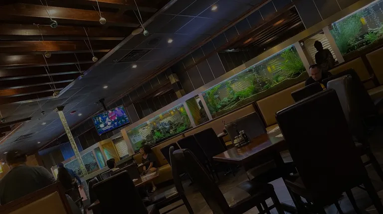 Inside restaurant with around five extremely large fish tanks aka as aquariums ..