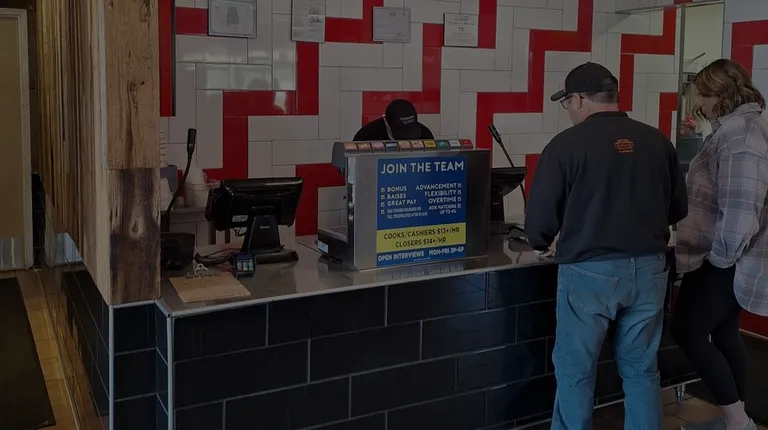 Sign on wall inside dining area.