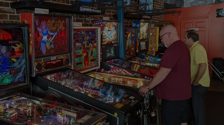 Pinball machines line the wall.