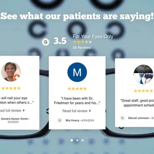 Something was not right with my vision, even with a somewhat new prescription from another office. Dr. Friedman's experience reviewed my prescription, and age and identified some inconsistencies. He examined my eyes and determined that my current prescription was too strong/overcorrected. His extensive experience and attention to detail enabled me to not only see better but he explained things to me that apply as I age. For me, his extensive experience made the difference in my recent office experience. I look forward to picking up my vintage eyeglasses that required special attention that his assistant handled for me.