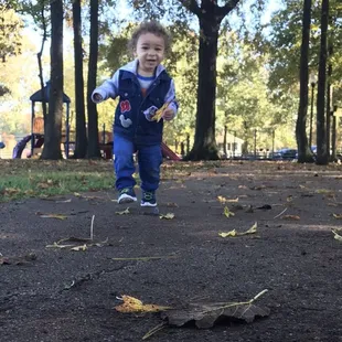 It's definitely autumn - leaves are down all around and it rained last night so it's a nice little mixture of went in autumn leaves covering the park -it's really nice for the kids to run around and explore nature -there's a swing area for toddlers and then a swing pair for older kids -there is a playground set up with the slide in Climbin bar
