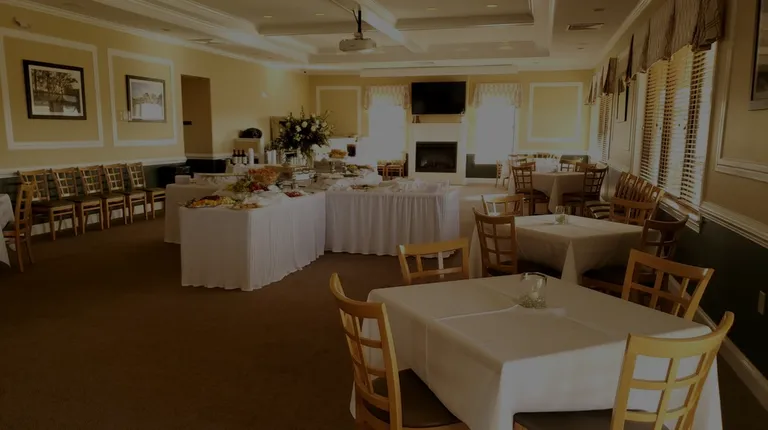 a banquet room with tables and chairs