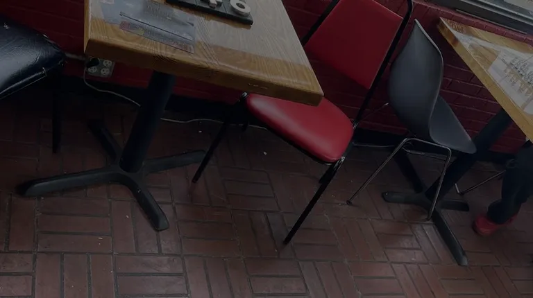 a checkered table and red chairs