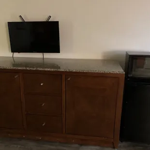 This hotel has been remodeled since February 2018, our suite was very clean and large. We had a private balcony. Mini bar, refrigerator, and microwave worked well. Flat screen tv. Nice sofa. Did not care for the 3 small flat pillows on our king size bed. Two people need 4 pillows. That was really our only gripe! Elevator was clean and in good working order. They do have free breakfast. It was a $89 room booked on Expedia for $49. Well worth the money. We will stay here again.
