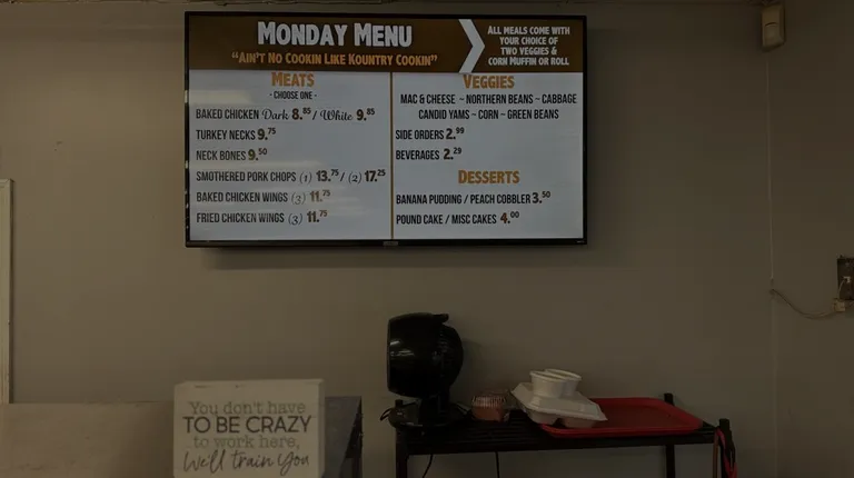 I was visiting from out of state and needed to stop somewhere for lunch. My Lyft driver recommended Kountry Cookin' and I could not be more grateful to her! The restaurant is pretty much as I expected for a shopping center location. It was clean and there was plenty of seating. I went in right at lunch time so the line was long. The staff was was rapidly replacing food as it got low. The line to order took a little longer than I expected but I wasn't in a rush so it wasn't a problem for me. I ordered baked chicken, greens, candied yams, and cornbread. Food is served in to go styrofoam containers then packed in a plastic bag regardless of if you plan to dine in or carry out. All of the food was well seasoned and cooked to perfection. The portions were large and the prices were fair.