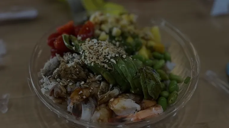 Shrimp and crawfish bowl with edamame, corn, cucumber, spring mix and Mango on top of sushi rice