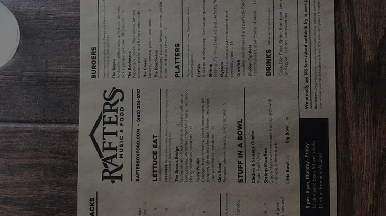 Rafters is a great addition to Oxford. It's large windows and great views on the second floor bring in tons of natural light. They feature live music on most nights and have a good crowd on the weekends. However, I recently went for lunch and it was a great surprise.The menu is well put together and has a good cajun offering. The food was surprisingly delicious. I tried the fried shrimp poboy and it was a great; featuring fresh Jumbo shrimp that was lightly breaded with Leindenheimer Bread from New Orleans. I suggest asking for the Cajun Ranch on side for the poboy. It comes with well seasoned fries and hushpuppies. The grilled shrimp with barbecue butter sauce as an appetizer was also delicious.I would have to say this is probably some the best food for a bar in Oxford. Also, on Sundays they feature brunch and offer bottomless mimosas for 10 bucks. 4 stars for the food and the great atmosphere.