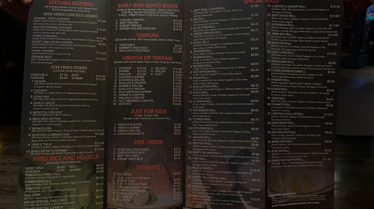 I don't usually write bad reviews, but just wanted to inform everyone since I gave them a glowing review a few years ago! They were really good for over 10 years but something has drastically changed in the kitchen. We tried eating in on a Friday night, hostess was great, server was great, restaurant was clean (a little cluttered), but all our dishes were "off"! My favorite sushi 40 kel was a little "funky" and we didn't finish it, my husband's favorite dish was not good. A lady sitting close to us returned soup that was way too salty. We thought it was odd since they have always been delicious, so today we tried a "to go" order. They took our order correctly and their customer service was great, but the food was Awful!! We tried different items Hunan Chicken, Fried Rice, Egg Rolls...all weirdly over over seasoned! Looks like there's a new cook in the kitchen.