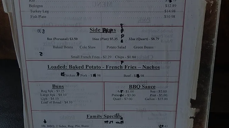 Great place to eat Excellent barbecue and really fine fries!Choice of sauces 2 home made that were both good.Does not look like much but well worth a stop!(Or even a detour to visit it!)