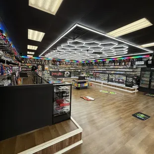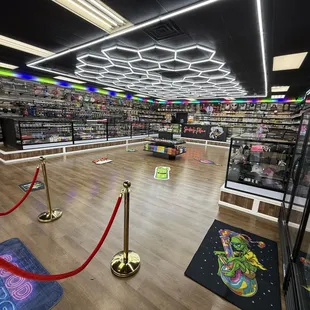 The smoke shop is a cozy, dimly lit space with a relaxed, almost retro vibe.