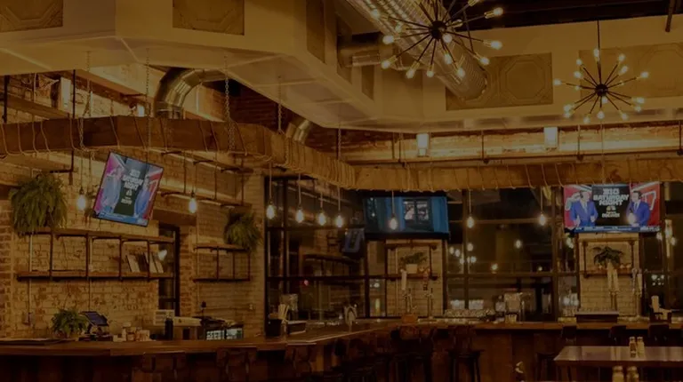 The Print Shop Restaurant upstairs seating area with a full bar to the back left