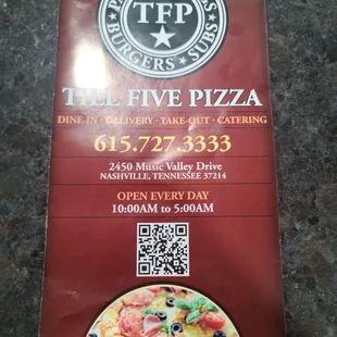 Who knew everywhere closed by 9 or 10 near the Opry? Thankfully we found Till Five, with a catchy name indicating that they're open til 5am. Thank goodness for this place! The restaurant itself is somewhat hodgepodge, with a live bird (in a cage) in the dining area, it was also incredibly hot the night we visited. The pizza was good, also somewhat hodgepodge flavor combo, but definitely would stop in again for a late night snack!