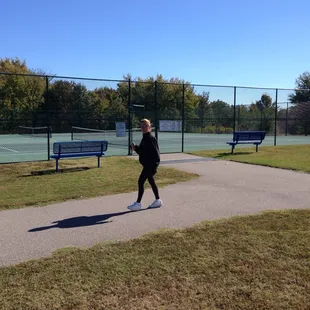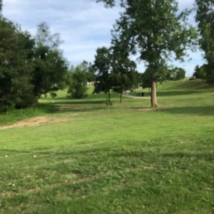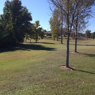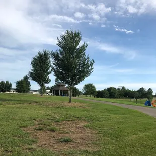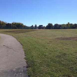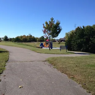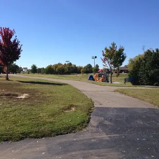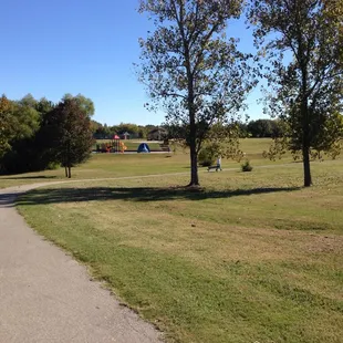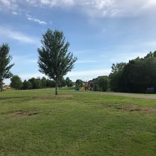 Great park! It has a nice paved trail for walkers, pet owners, and kids practicing their bicycle skills.Park has a giant field with a few new trees that we used as make shift soccer goals. Also has a tennis court open and a bathroom as an added bonus. Giant fire station next door which was cool. Playground looked fun too, but we were so excited about the other features we didn't try it out. (Maybe on another trip!)