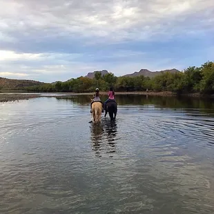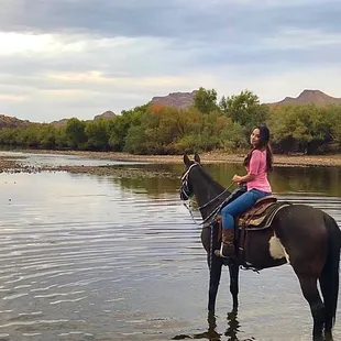 Absolutely the best and most memorable excursion experience from our Arizona trip! Mike and Shannon are some of the nicest, friendliest folks you'll ever meet, and you know for sure they are passionate about their horses (and other animals! You'll meet goats like Virgil and Sammich, dogs like Dixie and Maisy, a turkey, a tortoise, a donkey, and more!).I've been horseback riding before, but I was traveling with two friends who had never been. Mike and Shannon took this into account and paired us up with horses by their personalities. I was placed on top of Doc (and they'd actually accidentally forgotten his bridle (or something) so I used his lead rope tied into a makeshift one, which worked), my guy friend got Hannah, and my girl friend got Two Step. You can tell the horses are so well cared for and excellently trained. All it takes it a little suggestions with the reins and the horses follow directions and turn left and right like you are of the same mind. It's amazing! I've never ridden a horse without a bit in its mouth before, and I liked it better (as did the horses, it appears). Doc was funny, he LOVED to eat (like me). Every time we stopped he'd drop his head to eat anything that was around, even though I tried my hardest to pull his rope up. He even would grab mouthfuls on the go as we went. Hannah was very well behaved until we got into the Salt River, and her water-loving quirk came out and she wouldn't stop splashing with her foreleg. It was so adorable, but my friend's jeans and shoes ended up soaked haha! And Two Step is named because he can't quite stand still easily, and he had a bro relationship with Mike's horse (Moon) and HAD to stay right by him. I love how every horse has its own personality! This is not your run-of-the-mill trail ride. I've been on several trail rides where all you see is the butt of the horse in front of you and you're told to just stay in one line. Not this ride! You control your horse, and as long as you stay nearby (and depending on your comfort/experience level), you can go where you want to go. There's not one set trail, it's more of a direction that you're heading in. We signed up for the sunset 2-hr trail ride to look for wild horses (amazing, right?). It was just as breathtaking as it sounds. We paid $80 each (not including tax), which includes jumping into Mike's truck and trailering the horses down to the trail. There's a herd of 200 wild horses that live in that area. At first we didn't see anything (except gorgeous desert landscapes of course), but we went down to Salt River and it was just absolutely magical to see WILD HORSES wading in the river! Different family groups within the herd are called "bands," and we saw several bands as we rode along the river. Finally we found a spot to bring our horses into Salt River, and it was just gorgeous. There were wild horses nearby, our horses were enjoying drinking, splashing, and cooling off in the river, and the sun was setting to make the lighting gorgeous. Then we walked through a place called Sherwood Forest, which is so green that it really looks like you're not in the middle of the desert. We ended up losing track of time and stayed out past the 2-hr, but Mike and Shannon were all about giving us the experience of our lives. The whole experience was just beyond words. I am so grateful to Mike and Shannon for an awesome ride, and to our wonderful horses as well! If you're going to Mesa, definitely check this place out! Oh, and don't forget to ask Mike to show you his gun tricks -- ask him to shoot a water bottle out of Shannon's hand! ;)