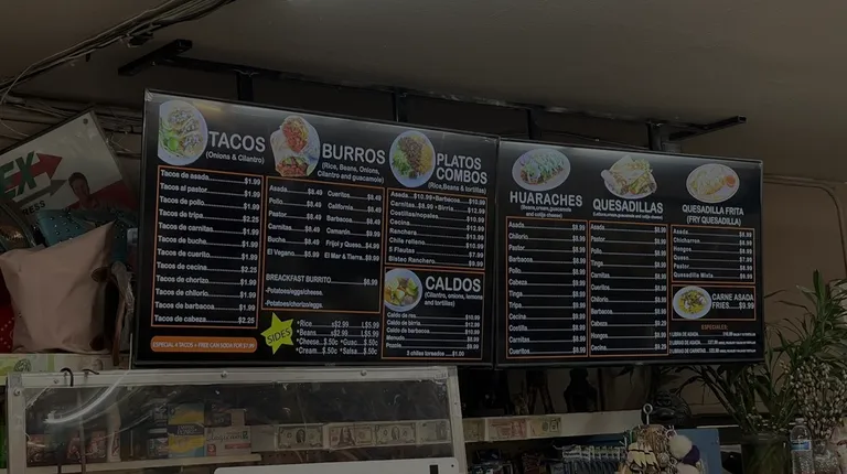 A friend recommended this place so I was picking up the order for us and 2 others. I couldn't find the menu anywhere online and relied on the two posted on here previously by customers. When I arrived it was confusing at first to find the menu or where to order because when you walk in its overheard so it wasnt until I walked to the back where the cooks were that I turned around and saw the food menus above the cashier at the front. I walked back up and ordered in spanish so i know for sure my order was given correct: quesadilla de asada en tortilla de maiz, 3 tacos asada plato con arroz y frijoles, asada fries y chile rellenos. My total was $51.85 - prices definitely increased since the last menu picture. She wrote my order on a blank paper and handed it to me after I paid and I stood there awkwardly not knowing what to do next so definitely confusing if it's your first time like me. I had to walk to the back and ask a cook what to do with the paper and she said to leave it there on the counter. After a bit the same cook asked me if this was to go (probably since I was alone with 4 items seemed odd) as I guess it wasnt written on there and I told her yes. The place is tiny, but busy! They also have a casa de cambio which is cool and convenient probably so when they said my food was ready I grabbed it and left quickly to make room for other people. When I got home I opened the food to realize they did not give me my chile rellenos and instead a quesadilla de pastor... i dont eat pork and its also a cheaper item than what I paid so not sure how that mix up happened since she must've written the right item since it matched the price. It was sad and disappointing since I couldn't switch my meal with anyone else since I don't eat pork or beef. I didnt call or go back to correct it since it was a 20 minute drive and I had people over at my home. My friends said the meat was really delicious, but for the prices and process of ordering, I will probably stick to Amados or Los Favs. I will say though the staff was very nice and the market inside is cool to find mexican food and goods.