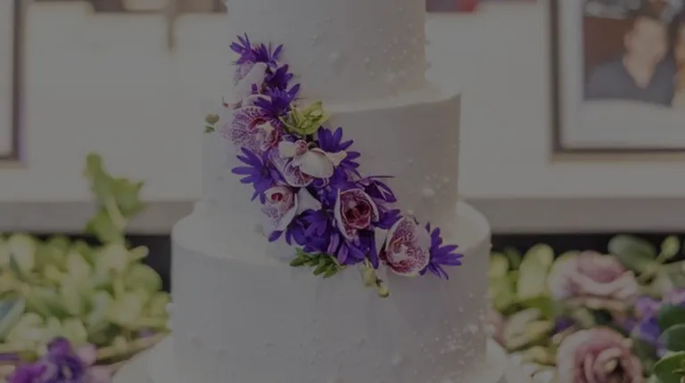 wedding cake with purple flowers