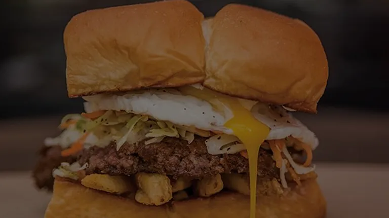 THE HANGOVER- white american cheese,smoked bacon,haus chili,fried egg,mayo