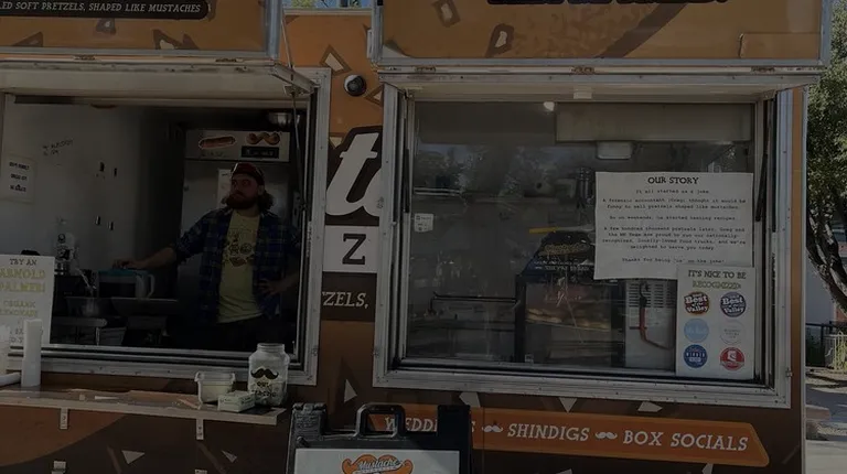 Foreground: An Original Mustache Pretzel Background: A blurry food truck