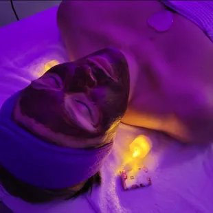 Relaxing amethyst face roller during a men's facial while their jelly mask sets