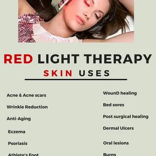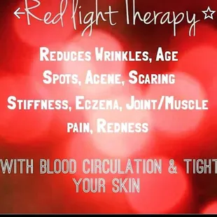 Redlight is a wonderful treatment. It gives me energy. It helps make my face less oily. It's a natural defense of pimples before they start. It makes my skin more healthy my skin feels younger. My face looks younger. Get 30 days of treatment was worth it. It took time for the effects to show up. It increased my over all vitality. I can't recommend enough. I am regular customer now, can't wait to see what the effects are like in a year. It's so gentle there are no side effects. There is no harshness of UV lamps. Truly a unique incredible treatment.