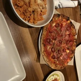 Really enjoyed the whole experience!! For starters we got the Grilled bread with Olive oil and the Crispy Eggplant Parmesan both of those were super yummy! For entrees our party of 3 ordered "the pig" pizza with the crust dipping sauce & the spicy rigatoni vodka pasta. What's not shown in the pictures we also tried the LASAGNA BIANCA AL FORNO. Every dish we tried literally 10/10 i was celebrating my birthday and they provide a free dessert that you can also have packed up and can take with you. The serving size was enough for us to share each plate. The overall vibe in the restaurant was amazing.