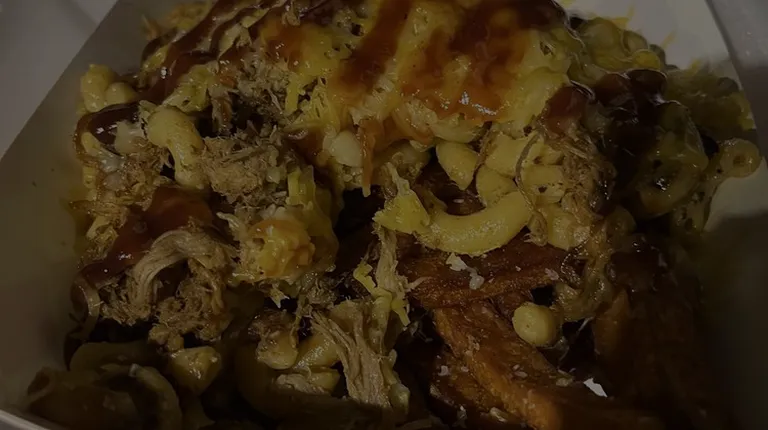 Piggy Bowl- pulled pork, mac n cheese, sweet potato fries, cheese, bbq sauce