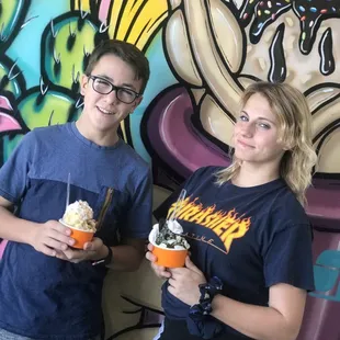 a woman holding a bowl of ice cream