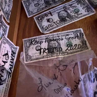 Went on a Sunday evening. It wasn't too busy but still had live music. I think it was a band but it sounded like karaoke.We had the cactus pizza. The toppings and mozzarella cheese were good but the crust was like a bowling alley crust.They don't have free water. You have to buy bottles of water. The dollar bills on the wall show that they target a very specific like-minded demographic. These patrons are loyal trumpers.