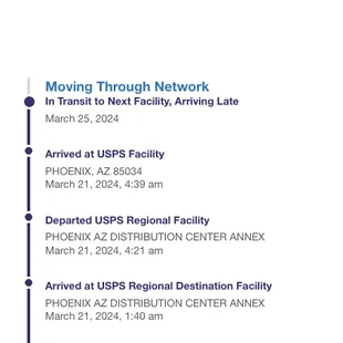 What is going on? When we send a mail, utilizing priority mail, we expect the USPS to hand our mail with care, and deliver it fast as promised.The message below has been sitting on their system since 3/21/2024 and today is 4/18/2024. That is over a month later for a mail that was to be delivered in 3 days. What are we suppose to do? Please deliver the mail as promised.If you can't deliver it, at least return it back to the sender then!