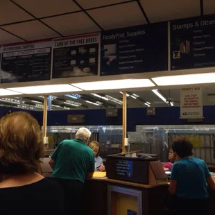 Have avoided this PO like the plague for several months, but had an important letter to mail. There were some different staff there and they seemed to have their A/C turned on this time, which was good because it was 106 degrees today.One of the employees actually came out into the waiting area and queried those in line personally about whether they were merely picking up or dropping off a package that already had postage, instructing them to report to the far left window.At the far right was a newer employee who is extremely tall and muscular and friendly. As each customer left his window, he apologized for the wait, as there was a long line. But he works very fast, so the wait is not because of him.The female at the far left pickup window was a little strange. She had a big head bandana and crazy eyes. She had no one at her window and wasn't doing anything, nor was she announcing to newly arrived customers that if they only had a pickup or drop off they could come to her window -- other employees seemed to take on that "heavy mantle" FOR her. She only gave confrontational stares to customers in line, like she wanted to jump over the counter and fight with them for looking at her (probably wondering what her job was).The other employees were working a little slower, but not as slow as PAST longtime employees used to (maybe they finally retired). There used to be a middle aged lady with short spiky hair that worked so slow it was almost impossible to tell if she was moving. Just watching her made me feel like I was going into a coma. Maybe she is finally gone. SHE is the one who always SHOULD have apologized for the wait...Dare I say things are improving slightly over there. At least they had 4 active windows going. I'm curious as to what accounts for their sudden new motivation to actually do the jobs for which they are being handsomely paid...It is in a convenient location with good parking access IF you are going northbound on 7th Avenue. Otherwise you are pretty much SOL.