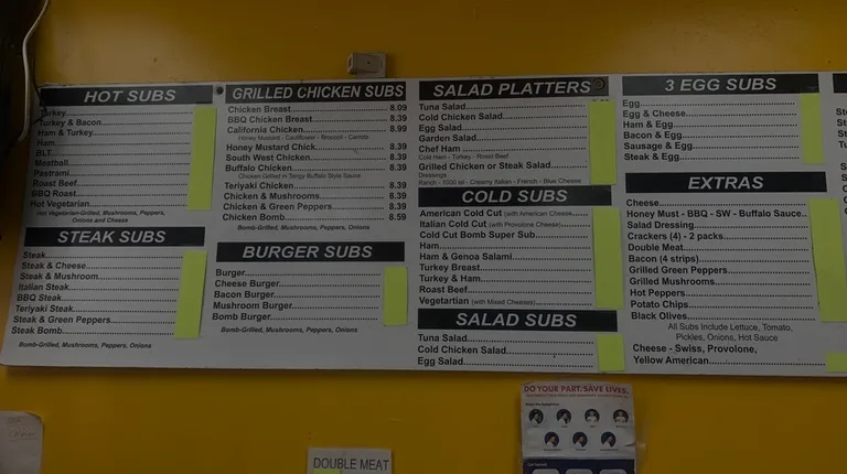 Close to home sub shop doing subs right. Everything is made right in front of you on a grill. Menu is large and they serve the usual cold and hot subs ranging from cold cut subs to steak bombs( green peppers,onion, and mushrooms) to triple meat subs. They have the regular veggie toppings like lettuce, tomato, pickles, and onions. They have a variety of cheese toppings as well. They do charge extra for additional toppings like bacon, jalapenos, black olives, wheat bread, etc (only sucky part in my opinion). They also have speciality subs like pastrami, Italian sausage, jerk chicken or pork, and more. Dont forget they also carry salads, cake slices, hot sausages, pork souce, and then some. Fountain drinks, bottled sodas and water is also available.You can also upgrade your sub for an additional cost for extra meat.Breakfast subs are also available just in case you have that sub craving in the morning.