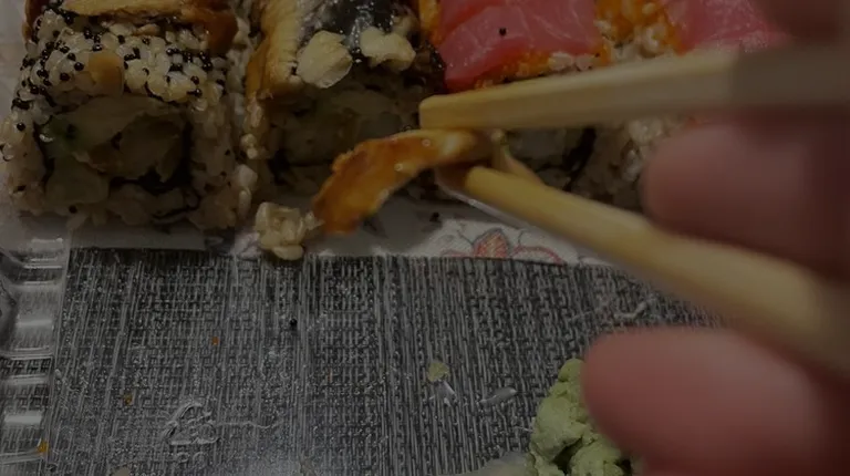 a hand holding a piece of sushi