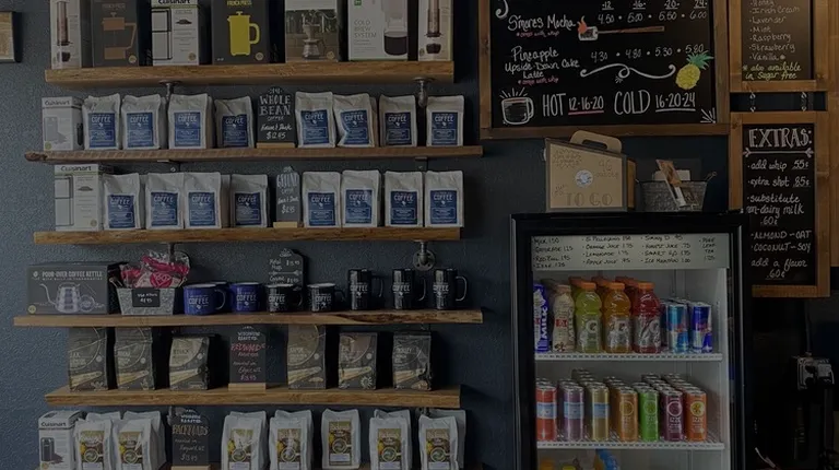 a shelf of coffee beans and coffee bags