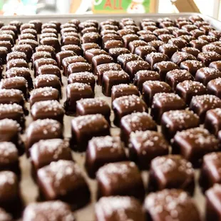 a variety of chocolates in a display case