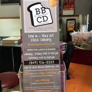 The Breaking Bread location in Cary has delivered consistent service and incredibly tasty food in all the years I've been going. While I have my menu favorites, I regularly try new items (the menu is surprisingly large), and I've honestly never been disappointed. The homemade chips and dill dip just can't be beat. (That is a menu item I always order!)We recently had them cater some baked potatoes for my company's work party. (We provided our own toppings, but needed someone local to provide the baked potatoes.) Teri was super easy to work with and quick in responding to my email questions. The baked potatoes were perfectly done on time and they were huge!Whether for an individual meal or for catering, you can't go wrong with Breaking Bread!