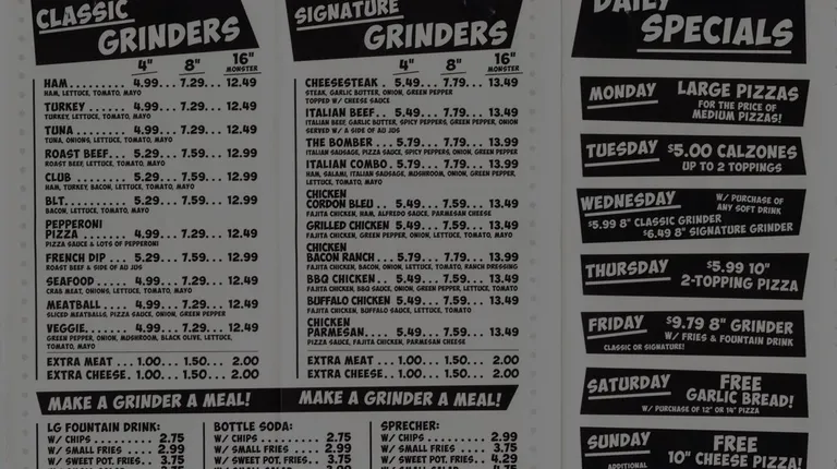 Stopped for lunch with a coworker since everything looked great on the menu and they offer daily specials. That day it was bogo pizzas, but my friend and I were in the mood to try the grinders(OBVI!!!!) and the calzones. Really wish I would have gone with the calzone and probably would have been a lot happier. Ordered the Italian grinder since the cashier told me it was the most popular(pepperoni, salami, sausage, ham, mozzarella, peppers, and sauce) Not a big fan of ham, but figured with all the other crap on it I wouldn't notice....basically was a hot ham with little of the other toppings. Reminded me a lot of Quiznos My friend got the meat calzone...looked fantastic with plenty of fillings. ...Large dining room with high tables and booths. ...Fountain soda ....Large condiment bar that has to-go hot sauce packets(love that)....Was kind of peeved they either forgot or don't include any kind of marinara or dipping sauce with the cheese bread. Will update next time I get to try their calzones and pizzas!